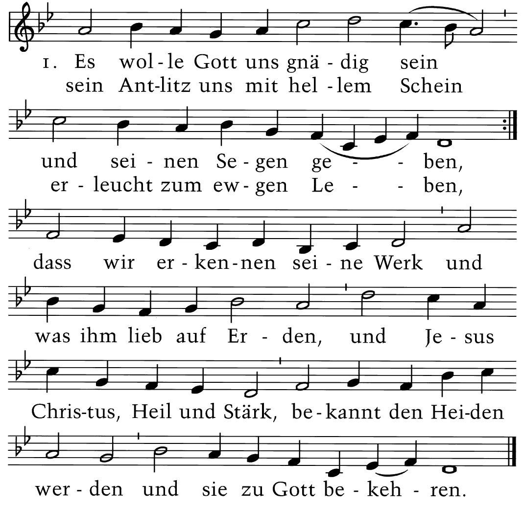 Es wolle Gott uns gnädig sein und seinen Segen geben, sein Antlitz uns mit hellem Schein erleucht zum ewgen Leben, daß wir erkennen seine Werk und was ihm lieb auf Erden, und Jesus Christus, Heil und Stärk, bekannt den Heiden werden und sie zu Gott bekehren.