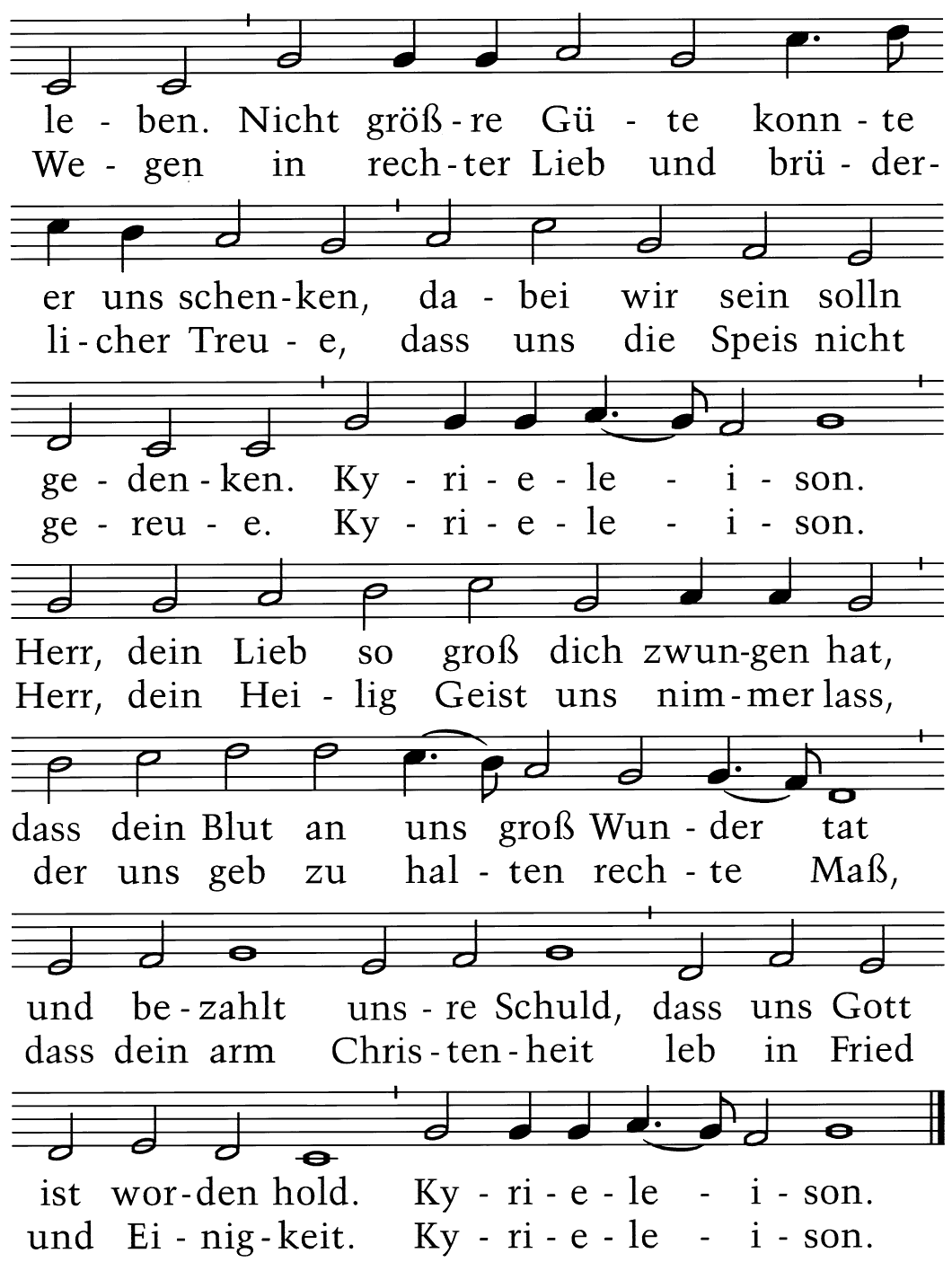 Gott geb uns allen seiner Gnade Segen, daß wir gehn auf seinen Wegen in rechter Lieb und brüderlicher Treue, daß uns die Speis nicht gereue. Kyrieleison. Herr, Dein Heilig Geist uns nimmer laß, der uns geb zu halten rechte Maß, daß Dein arm Christenheit leb in Fried und Einigkeit. Kyrieleison.