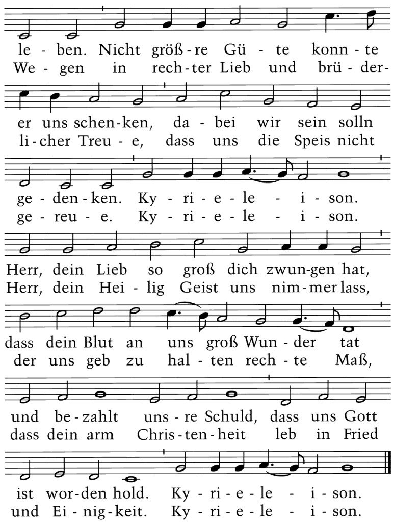 Der heilig Leichnam ist für uns gegeben zum Tod, daß wir dadurch leben. Nicht größer Güte konnte er uns schenken, dabei wir sein solln gedenken. Kyrieleison. Herr, Dein Lieb so groß Dich zwungen hat, daß Dein Blut an uns groß Wunder tat und bezahlt unsre Schuld, daß uns Gott ist worden hold. Kyrieleison.