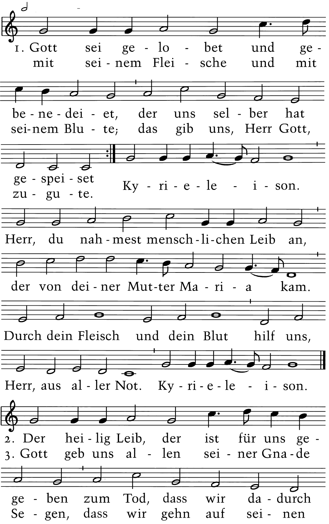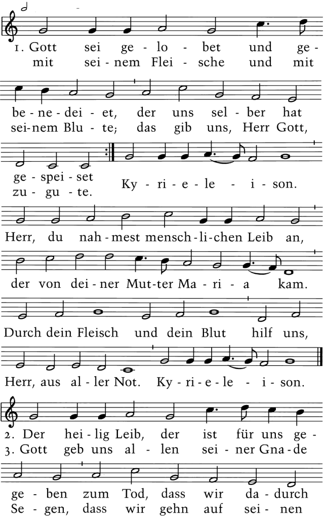 Gott sei gelobet und gebenedeiet, der uns selber hat gespeiset mit seinem Fleische und mit seinem Blute; das gib uns, Herr Gott, zugute. Kyrieleison. Herr, durch Deinen heiligen Leichnam, der von Deiner Mutter Maria kam, und das heilige Blut, hilf uns, Herr, aus aller Not. Kyrieleison.