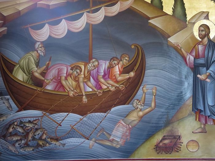 Fresco of the Miraculous Catch of Fish, and Peter swimming to shore, in the Greek Orthodox Church in Capernaum, Galilee. Photo Pilgrim Pat