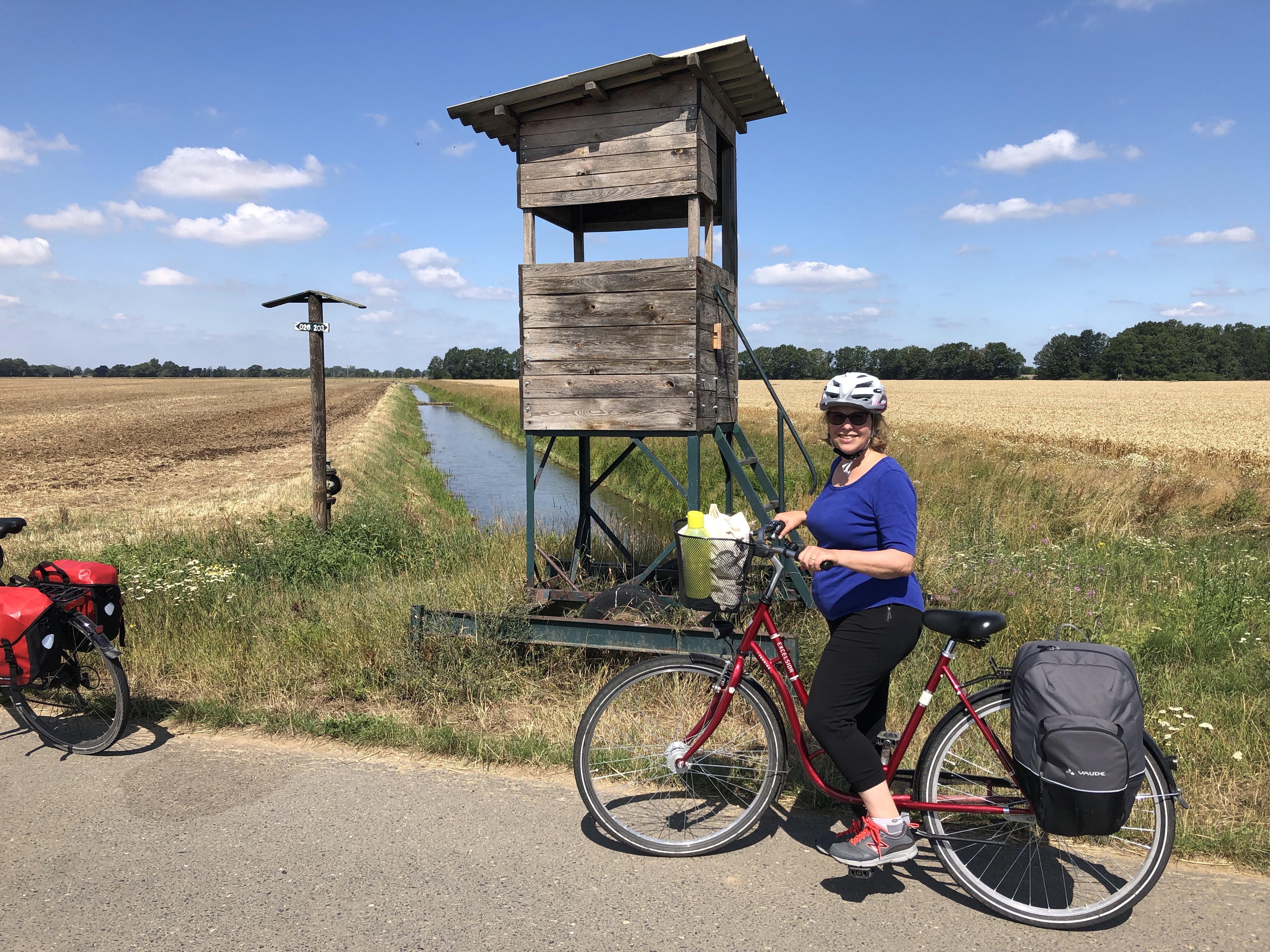Auf dem Elberadweg fährts sich gut – wenn er denn nicht repariert oder aus sonstigen Gründen umgeleitet wird. Nach Google wärs auf den Landstraßen kürzer und vielleicht sogar schneller gegangen. Die B187 mit LKWs und eiligen Flitzern zu teilen ist zwar spannend, aber nicht wirklich erholsam. Da sind die kl.Nebenstraße schon besser. Da gibts dann auch Rehe zu sehen, Reiher und Kraniche (über 60 haben wir gezählt!) oder lassige Spaziergänger und Hundeführer, manchmal auch den Tourist, der seinen Camper in den Bach entleert – Schreck, oh Schreck. Und ich dachte, das tut man nicht in Deutschland… Kirchen gibts viele. Meist evangelisch und sogar lutherisch. Kühle Orte – einladend und gut in Stand gehalten. Meistens waren wir froh, wenn wir von den befahrenen Wegen wieder alleine auf dem Elberadweg fuhren – und diesen nur mit freundlichen und eifrig grüßenden Radfahrern teilten. Das Grüßen ließ natürlich immer mit der Hitze nach und die Senioren, die auf ihren E-Bikes dahergesaust kamen, konnten sich auch kaum zum Grüßen hinreißen lassen. Es ging alles viel zu schnell. Wir haben es wiederholt erlebt, dass sie am Ziel vorbeischossen – die Abzweigungen des Radweges verpaßten und uns dann irgendwann wieder mit Karacho ein- und überholten. E-Roller haben wir aber erst in Dresden erlebt. Bis dahin ging alles gut.