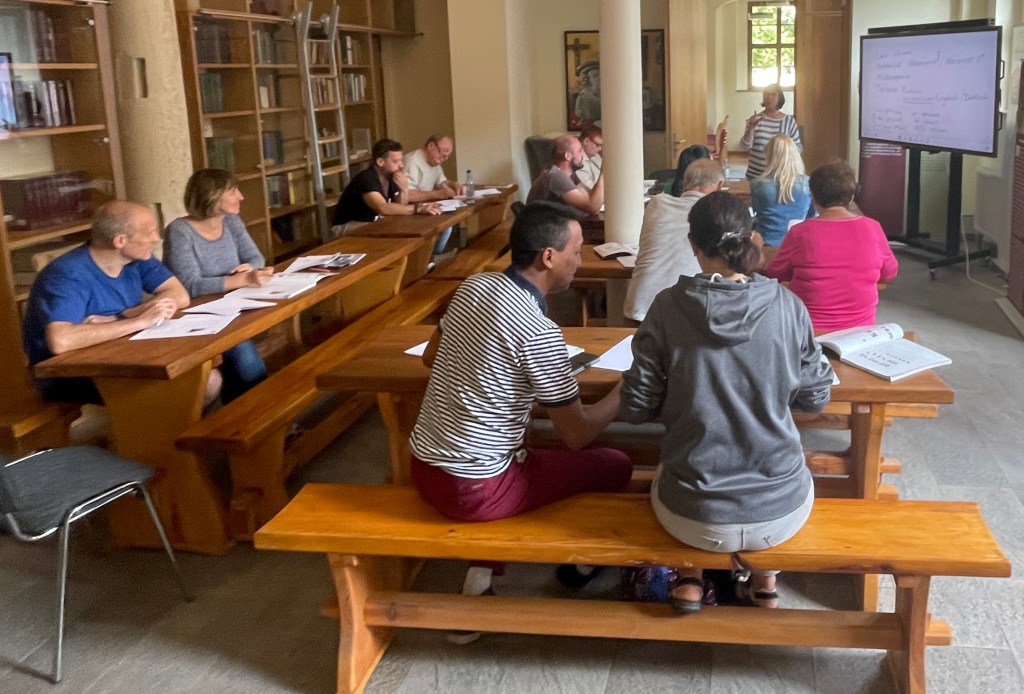 Just conversing did not suffice. So, I ordered course books as well as workbooks from Cornelsen. This makes teaching and learning much more efficient. The books are excellent, the e-book and listening exercises can easily be downloaded on everyone’s phone and enable the students to practice at home as well. I am extremely grateful to the Lutheran Church Missouri Synode, who made funds available to sponsor the books via their Eurasia Mission section, which supports this outreach to Ukrainian refugees. The digital smart board is a modern and helpful tool for teaching, which can be used simply as a writing board but also, I can connect my laptop to show the e-book, or the video clips included in the learning material. So, we are well equipped – which makes the classes not only more professional but also lots of fun.