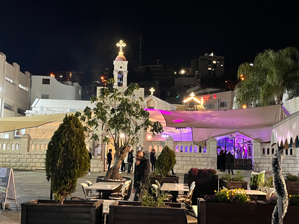 The choir was very Palestinian. I could not make out a word. There was a lot of solo singing – in oriental style – with loudspeakers, fancy lighting and even mist machines and accompanied with traditional violins, lyres and string instruments. It was not really my style, but I was impressed by the huge crowd of seriously distinguished guests. The men looked like from the best Lutheran church councils and the women were stylishly dressed in black, with veils and lots of jewelry and finery. They could have been members of any Lutheran women´s league around the world. The men wore no hats. They had enough hair – grey, dense and well kept. They all wore warm clothing, because it was chilly and we were sitting outside the church of the Annunciation. We felt most welcome in their midst, even if we only found places right at the back with the old men. We left somewhat around 10h00 and made our way back to the hotel.