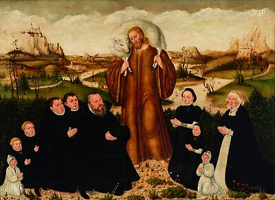 Epitaph for Margarethe Drachstedt, ne Major and family: “The good Shepherd” by Lucas Cranach jr after 1573 (City church St. Marys, Wittenberg).