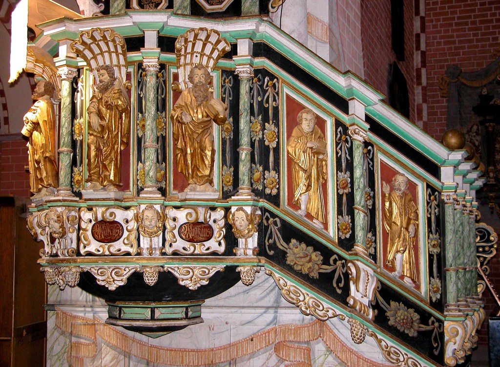 Evangelisten am Korpus sowie Reliefs von Dr. Martin Luther und Philip Melanchthon am Treppenaufgang.