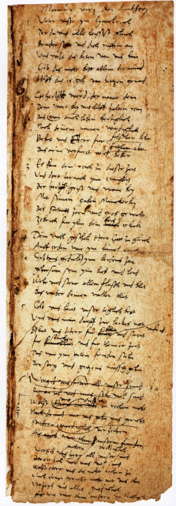 Vater unser im Himmelreich, der du uns alle heißest gleich Brüder sein und dich rufen an und willst das Beten von uns han: gib, dass nicht bet allein der Mund, hilf, dass es geh von Herzensgrund.