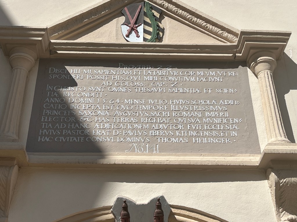 In the year of the Lord 1564 in the month of July, the construction of this school was begun, during the time of the most illustrious Prince of Saxony, August, Elector of the Holy Roman Empire, who governed this land and gave his support to this building when Dr. Paul Eber of Kitzingen was pastor of this church and Thomas Heiliger was mayor of this town.