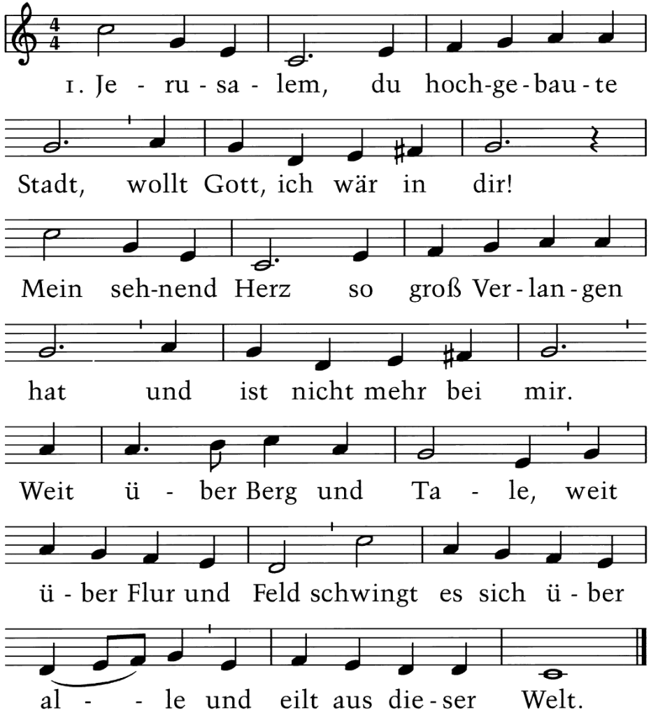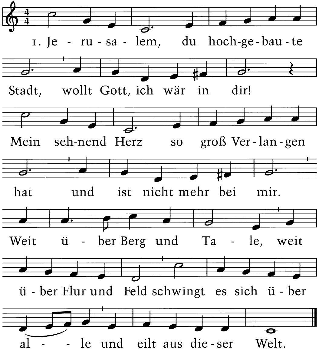 O Ehrenburg, nun sei gegrüßet mir, tu auf der Gnaden Pfort; wie große Zeit hat mich verlangt nach Dir, eh ich bin kommen fort aus jenem bösen Leben, aus jener Nichtigkeit, und mir Gott hat gegeben das Erb der Ewigkeit.