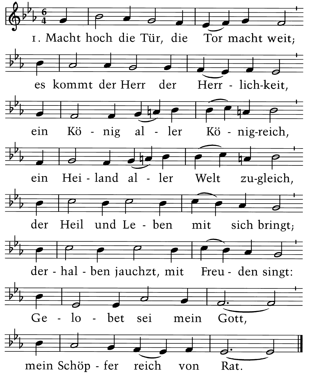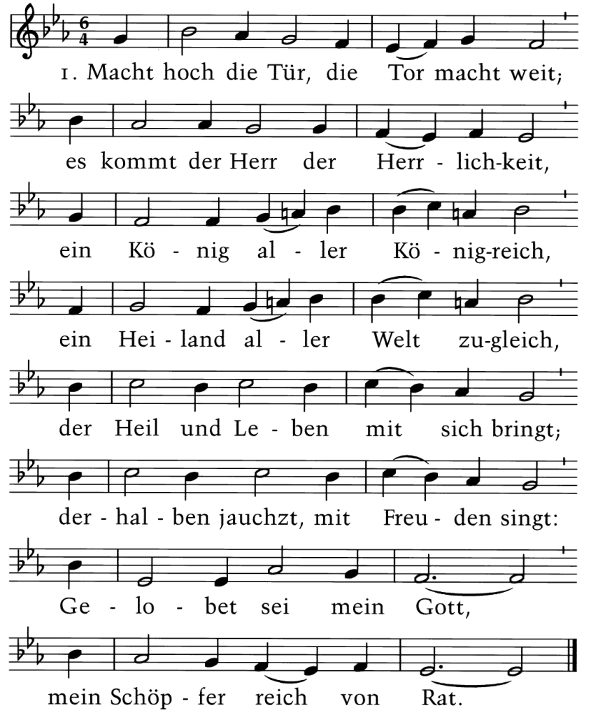 4. Macht hoch die Tür, die Tor macht weit, Eu’r Herz zum Tempel zubereit’. Die Zweiglein der Gottseligkeit steckt auf mit Andacht, Lust und Freud; so kommt der König auch zu Euch, ja, Heil und Leben mit zugleich. Gelobet sei mein Gott, voll Rat, voll Tat, voll Gnad.