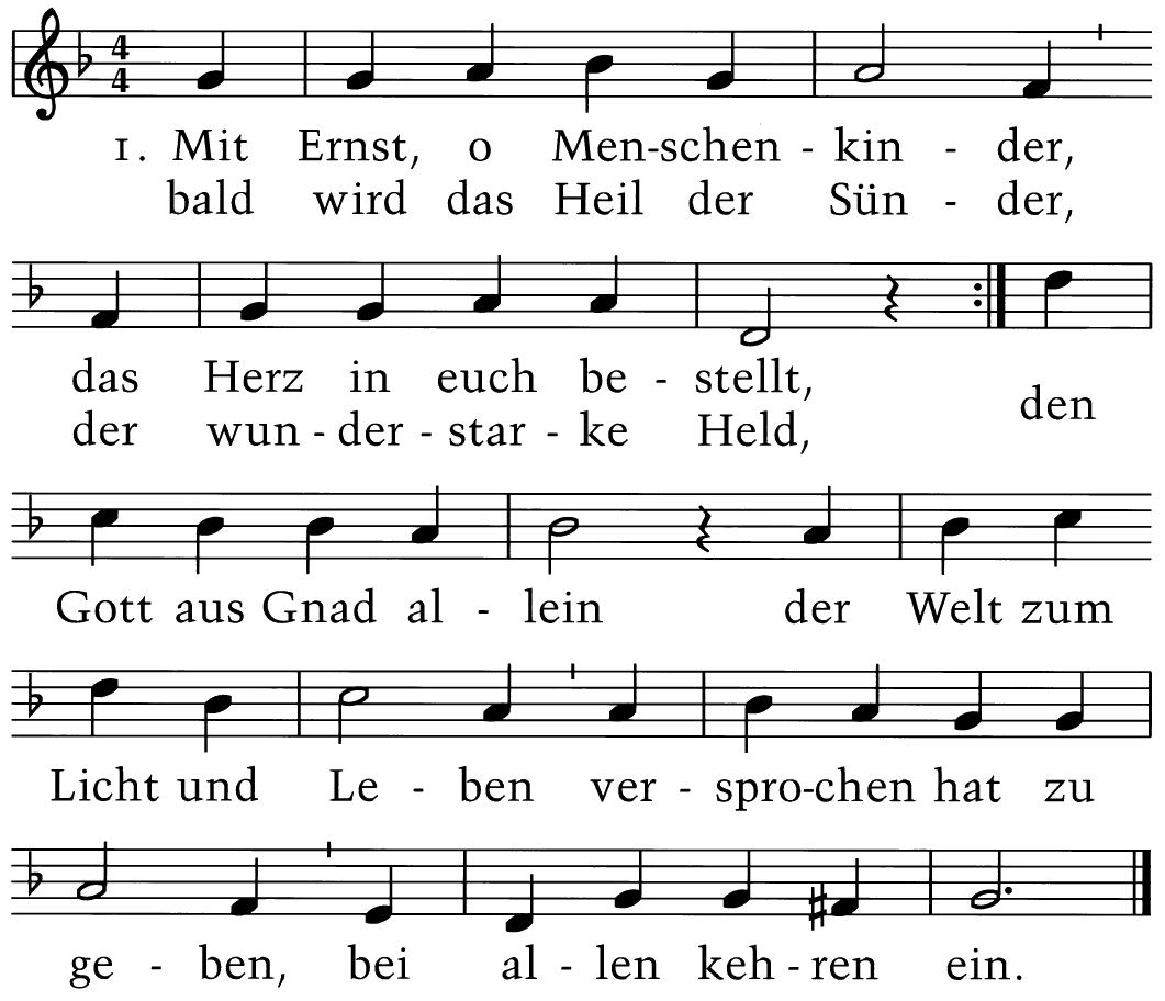 2. Bereitet doch fein tüchtig den Weg dem großen Gast; macht seine Steige richtig, laßt alles, was er haßt; macht alle Bahnen recht, die Tal laßt sein erhöhet, macht niedrig, was hoch stehet, was krumm ist, gleich und schlecht.