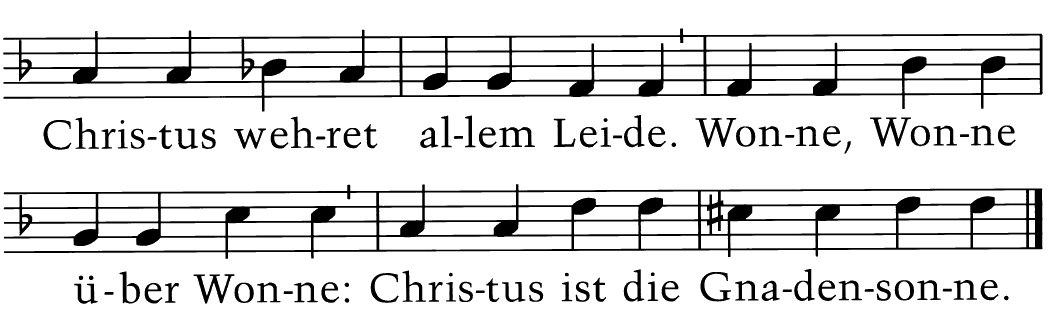 4. Jesu, nimm Dich Deiner Glieder ferner noch in Gnaden an; schenke, was man bitten kann, und erquick uns alle wieder; gib der ganzen Christenschar Frieden und ein seligs Jahr. Freude, Freude über Freude: Christus wehret allem Leide. Wonne, Wonne über Wonne: Christus ist die Gnadensonne.