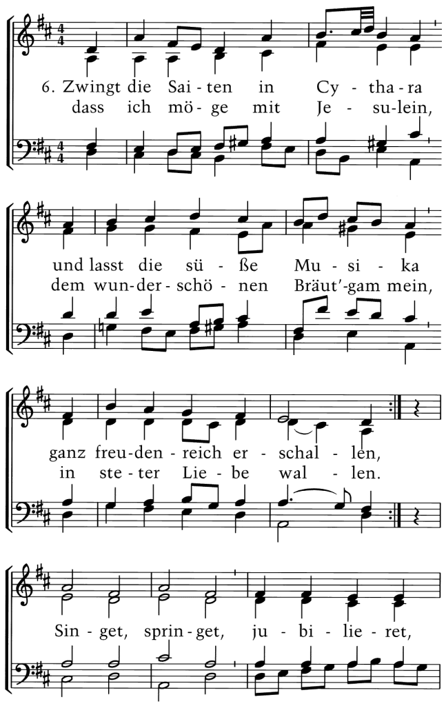 Zwingt die Saiten in Cythara und lasst die süße Musica ganz freudenreich erschallen, daß ich möge mit Jesulein, dem wunderschönen Bräut’gam mein, in steter Liebe wallen. Singet, springet, jubilieret, triumphieret, dankt dem Herren; groß ist der König der Ehren.