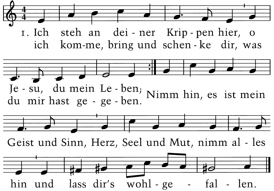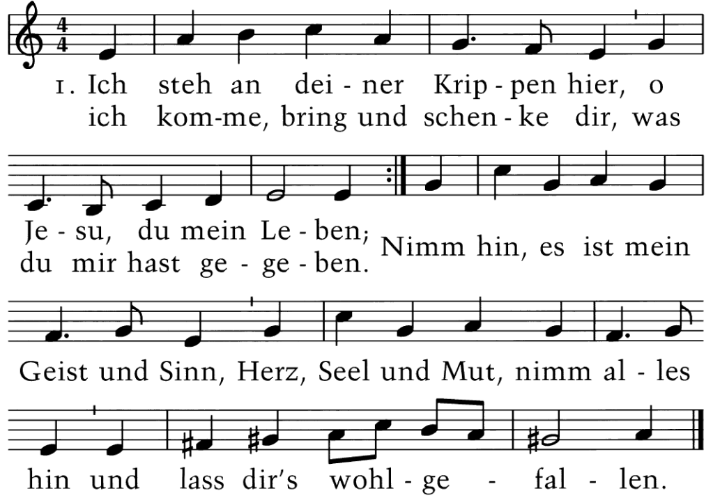 Ich steh an Deiner Krippen hier, o Jesulein, mein Leben; ich komme, bring und schenke Dir, was Du mir hast gegeben. Nimm hin, es ist mein Geist und Sinn, Herz, Seel und Mut, nimm alles hin und lass Dir’s wohlgefallen.