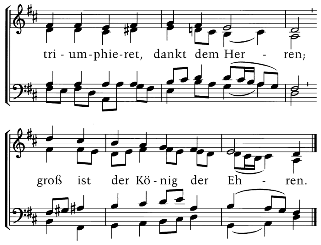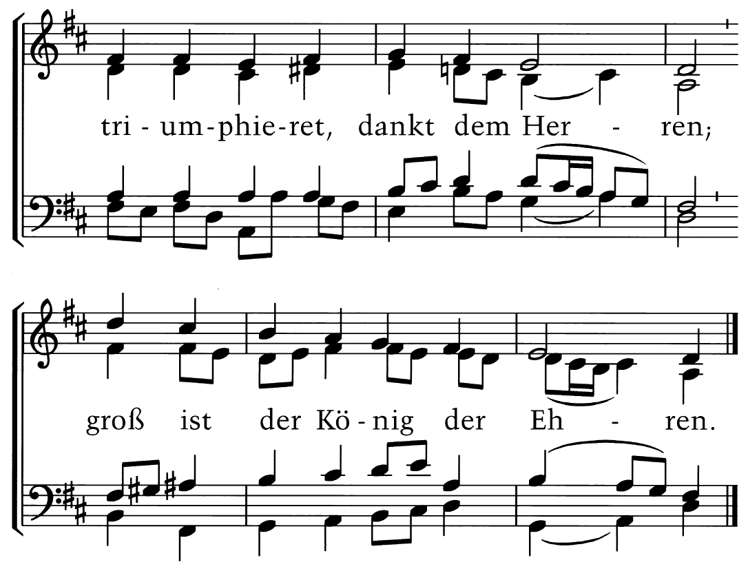 Zwingt die Saiten in Cythara und laßt die süße Musika ganz freudenreich erschallen, daß ich möge mit Jesulein, dem wunderschönen Bräutgam mein, in steter Liebe wallen. Singet, springet, jubilieret, triumphieret, dankt dem Herren; groß ist der König der Ehren.