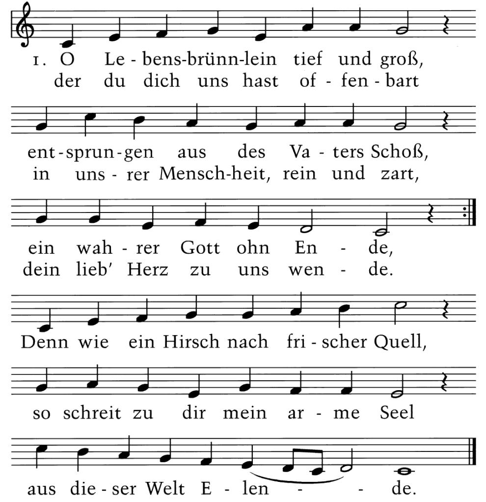 O Lebensbrünnlein tief und groß, entsprungen aus des Vaters Schoß, ein wahrer Gott ohn Ende, der Du Dich uns hast offenbart in unsrer Menschheit, rein und zart, Dein lieb’ Herz zu uns wende. Denn wie ein Hirsch nach frischer Quell, so schreit zu Dir mein arme Seel aus dieser Welt Elende.