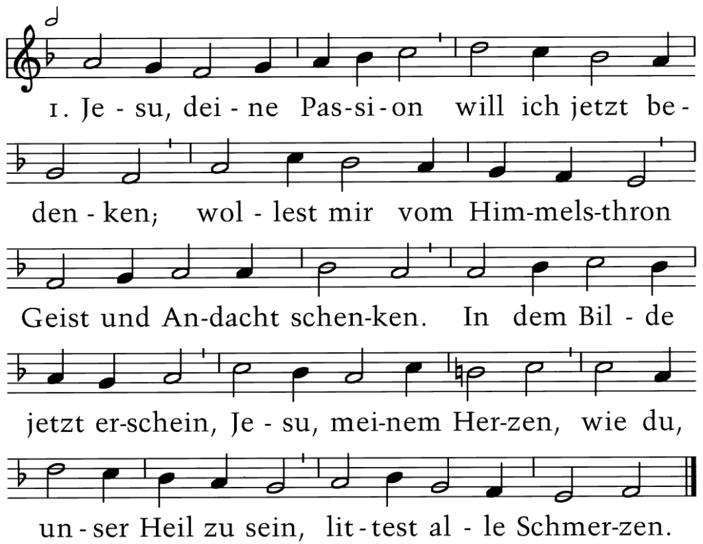 Jesu, Deine Passion will ich jetzt bedenken; wollest mir vom Himmelsthron Geist und Andacht schenken. In dem Bilde jetzt erschein, Jesu, meinem Herzen, wie Du, unser Heil zu sein, littest alle Schmerzen.