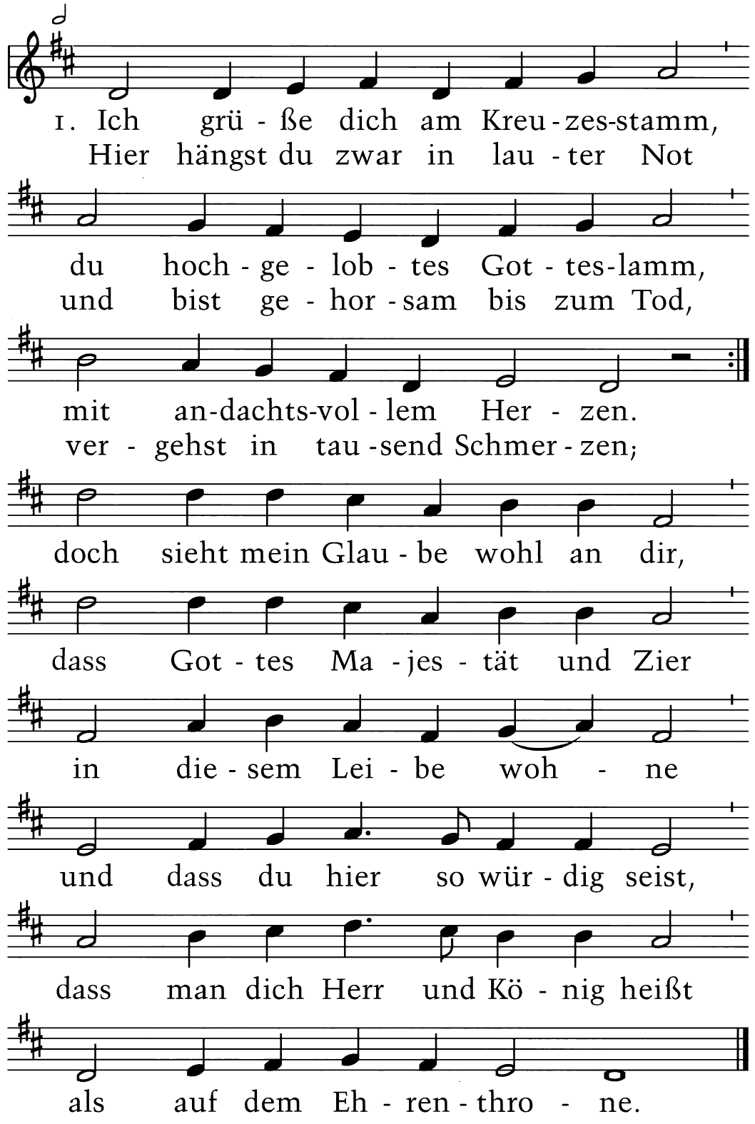 Ich grüße Dich am Kreuzesstamm, Du hochgelobtes Gotteslamm, mit andachtsvollem Herzen. Hier hängst Du zwar in lauter Not und bist gehorsam bis zum Tod, vergehst in tausend Schmerzen; doch sieht mein Glaube wohl an Dir, daß Gottes Majestät und Zier in diesem Leibe wohne und daß Du hier so würdig seist, daß man Dich Herr und König heißt als auf dem Ehrenthrone.