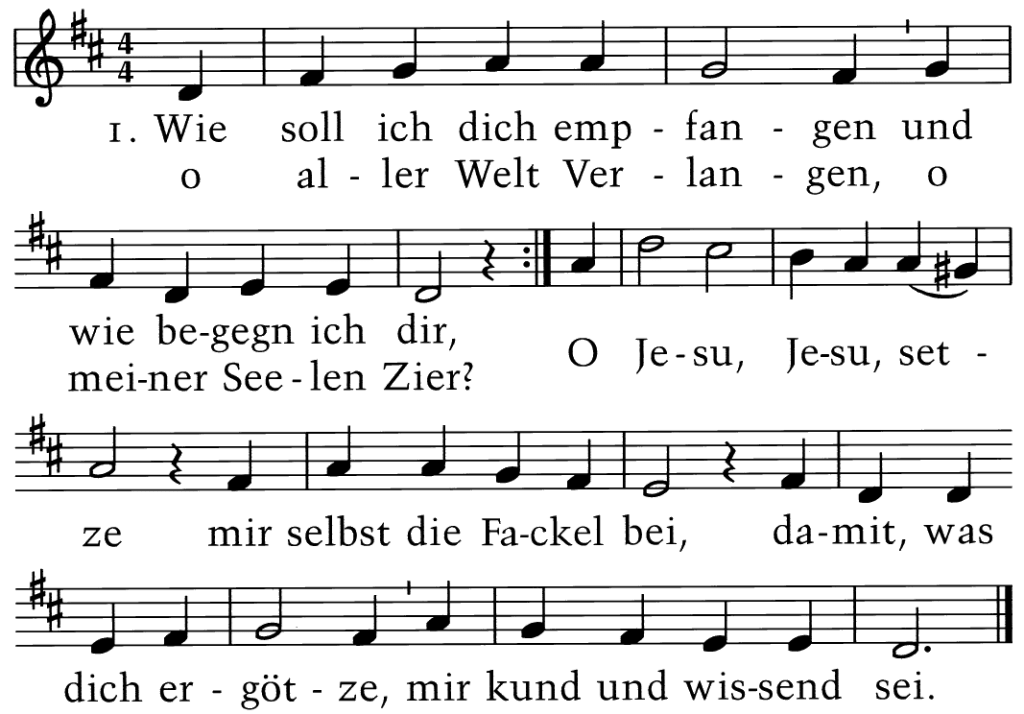 Wie soll ich Dich empfangen und wie begegn ich Dir, o aller Welt Verlangen, o meiner Seelen Zier? O Jesu, Jesu, setze mir selbst die Fackel bei, damit, was Dich ergötze, mir kund und wissend sei.