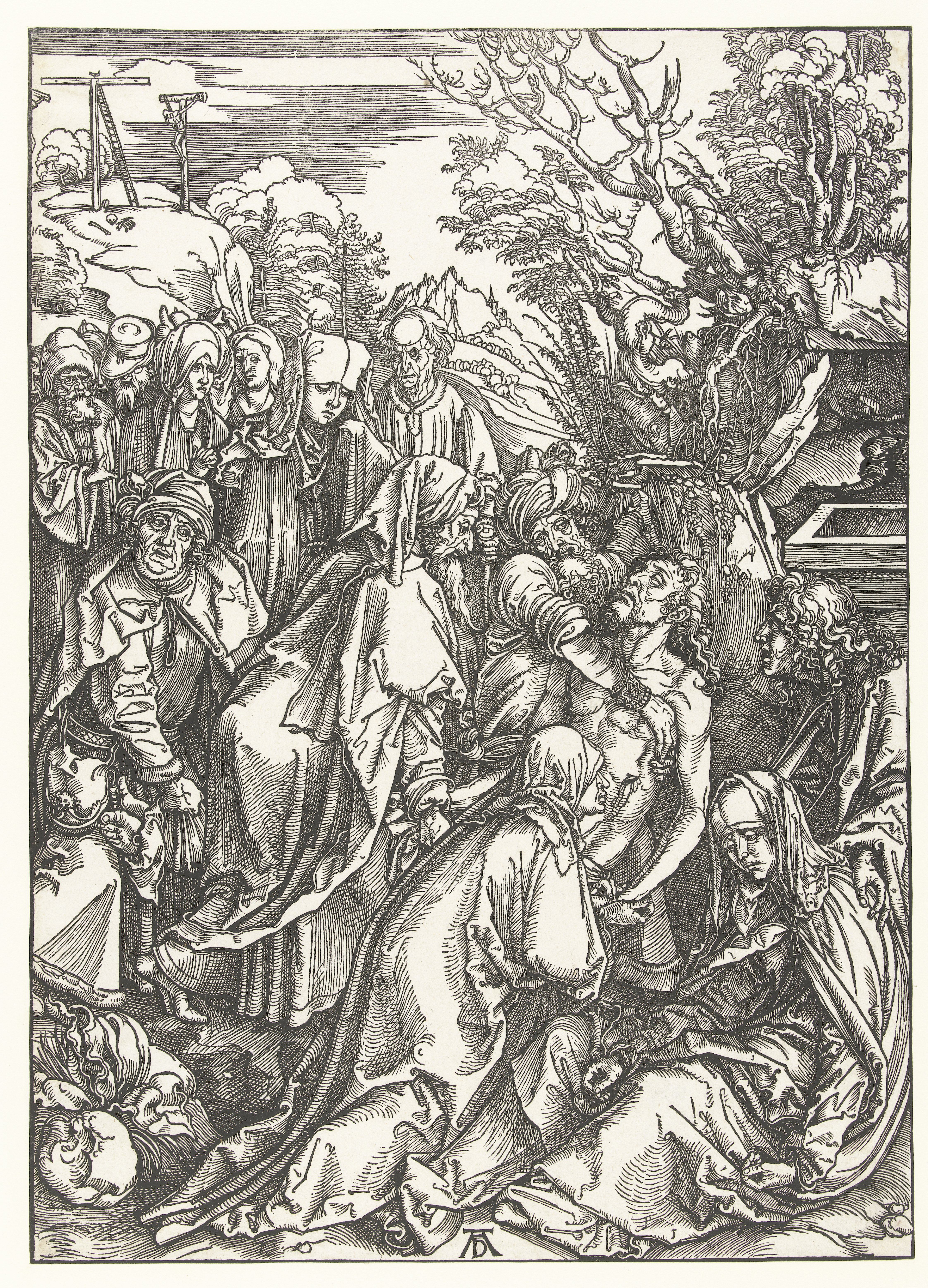 Am Abend aber kam ein reicher Mann von Arimathia, der hieß Joseph, welcher auch ein Jünger Jesu war. Der ging zu Pilatus und bat ihn um den Leib Jesus. Da befahl Pilatus man sollte ihm ihn geben. Und Joseph nahm den Leib und wickelte ihn in eine reine Leinwand und legte ihn in sein eigenes Grab, welches er hatte lassen in einen Fels hauen, und wälzte einen großen Stein vor die Tür des Grabes und ging davon. Es war aber allda Maria Magdalena und die andere Maria, die setzten sich gegen das Grab.