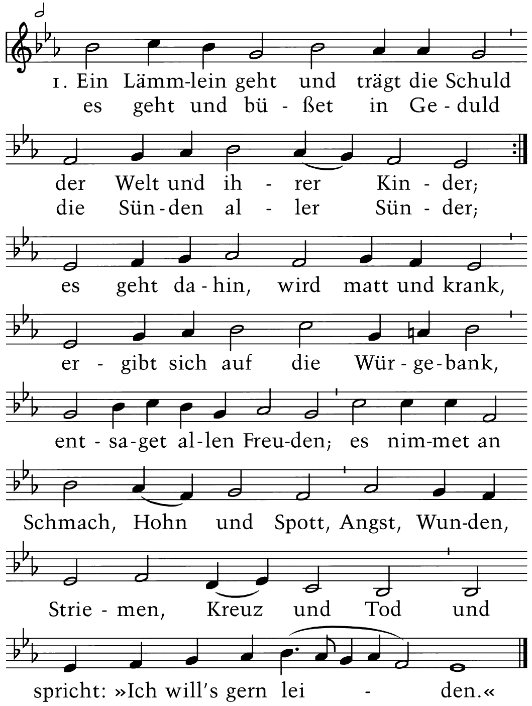 Ein Lämmlein geht und trägt die Schuld der Welt und ihrer Kinder; es geht und büßet in Geduld die Sünden aller Sünder; es geht dahin, wird matt und krank, ergibt sich auf die Würgebank, entsaget allen Freuden; es nimmet an Schmach, Hohn und Spott, Angst, Wunden, Striemen, Kreuz und Tod und spricht: »Ich will’s gern leiden.«