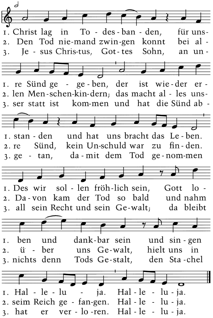 Christ lag in Todesbanden, für unsre Sünd gegeben, der ist wieder erstanden und hat uns bracht das Leben. Des wir sollen fröhlich sein, Gott loben und dankbar sein und singen Halleluja. Halleluja.