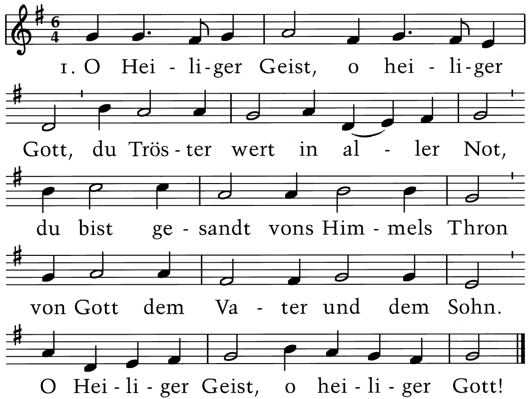O Heiliger Geist, o heiliger Gott, Du Tröster wert in aller Not, Du bist gesandt vons Himmels Thron von Gott dem Vater und dem Sohn. O Heiliger Geist, o heiliger Gott!