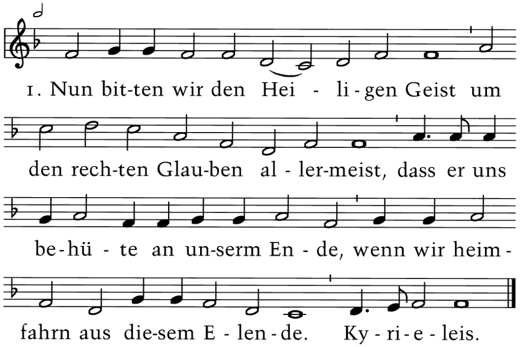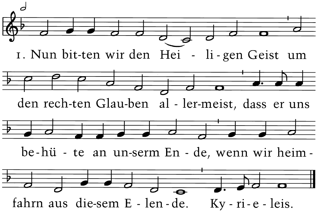Nun bitten wir den Heiligen Geist um den rechten Glauben allermeist, daß er uns behüte an unserm Ende, wenn wir heimfahrn aus diesem Elende. Kyrieleis.