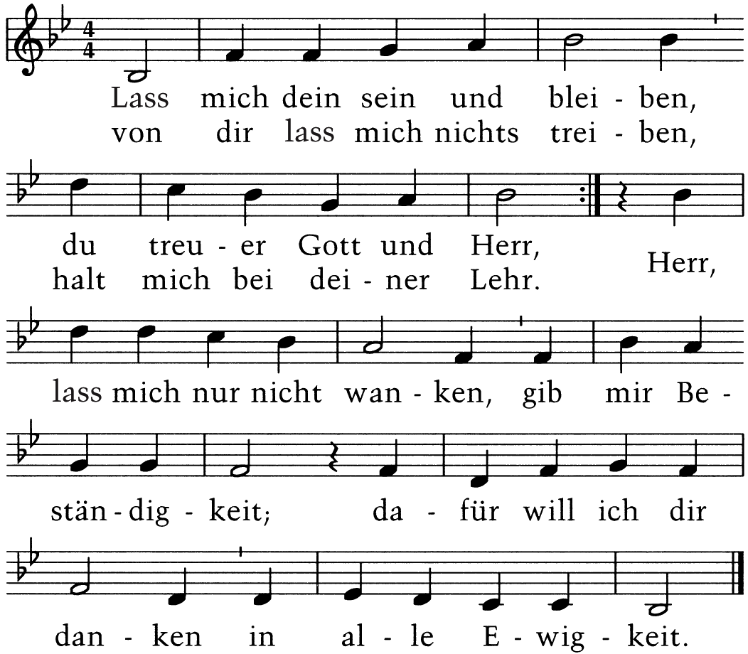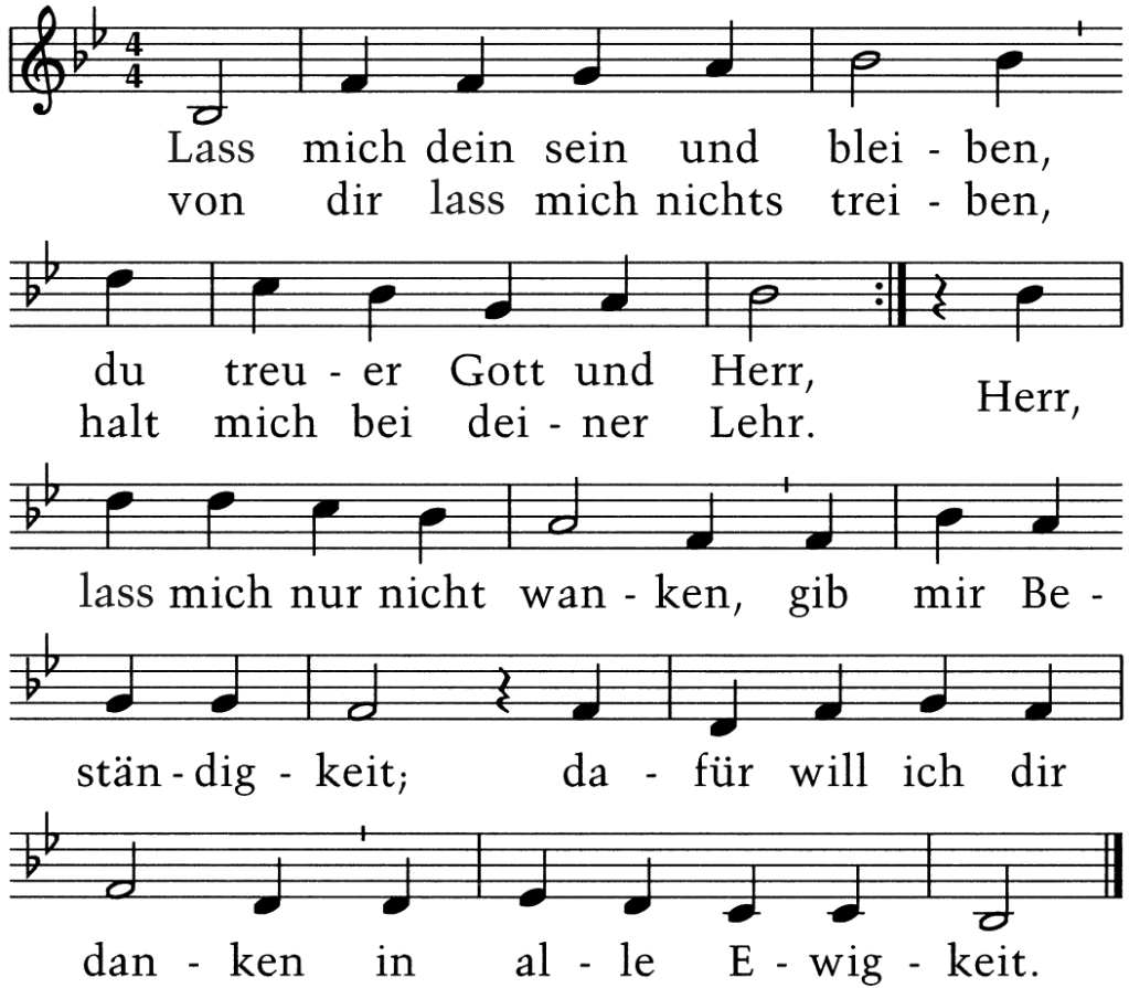 Laß mich Dein sein und bleiben, Du treuer Gott und Herr, von Dir lass mich nichts treiben, halt mich bei Deiner Lehr. Herr, lass mich nur nicht wanken, gib mir Beständigkeit; dafür will ich Dir danken in alle Ewigkeit.