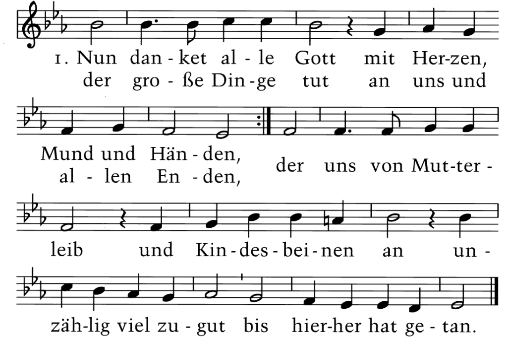 Nun danket alle Gott mit Herzen, Mund und Händen, der große Dinge tut an uns und allen Enden, der uns von Mutterleib und Kindesbeinen an unzählig viel zugut bis hierher hat getan.