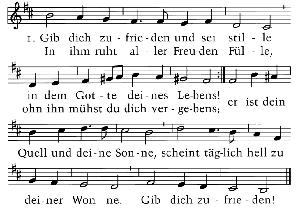 Gib Dich zufrieden und sei stille in dem Gotte Deines Lebens! In ihm ruht aller Freuden Fülle, ohn ihn mühst Du Dich vergebens; er ist Dein Quell und Deine Sonne, scheint täglich hell zu Deiner Wonne. Gib Dich zufrieden!