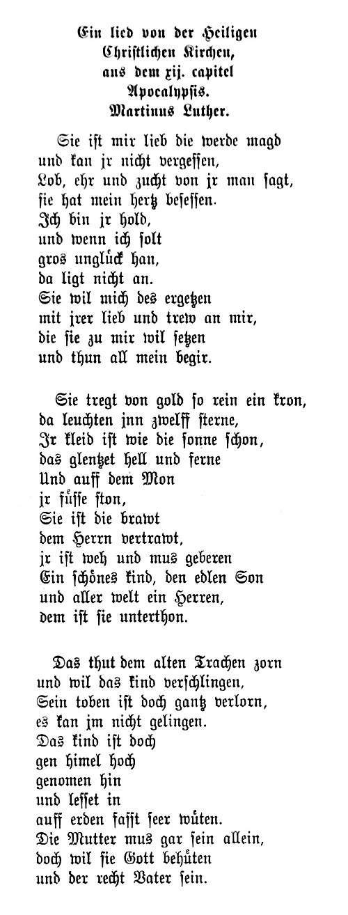 Sie trägt von Gold so rein ein Kron, da leuchten in zwölf Sterne, ihr Kleid ist wie die Sonne schon, das glänzet hell und ferne; und auf dem Mond ihr Füße stehn; sie ist die Braut, dem Herrn vertraut. Ihr ist weh und muss gebären ein schönes Kind, den edlen Sohn und aller Welt ein Herren, dem sie ist untertan.