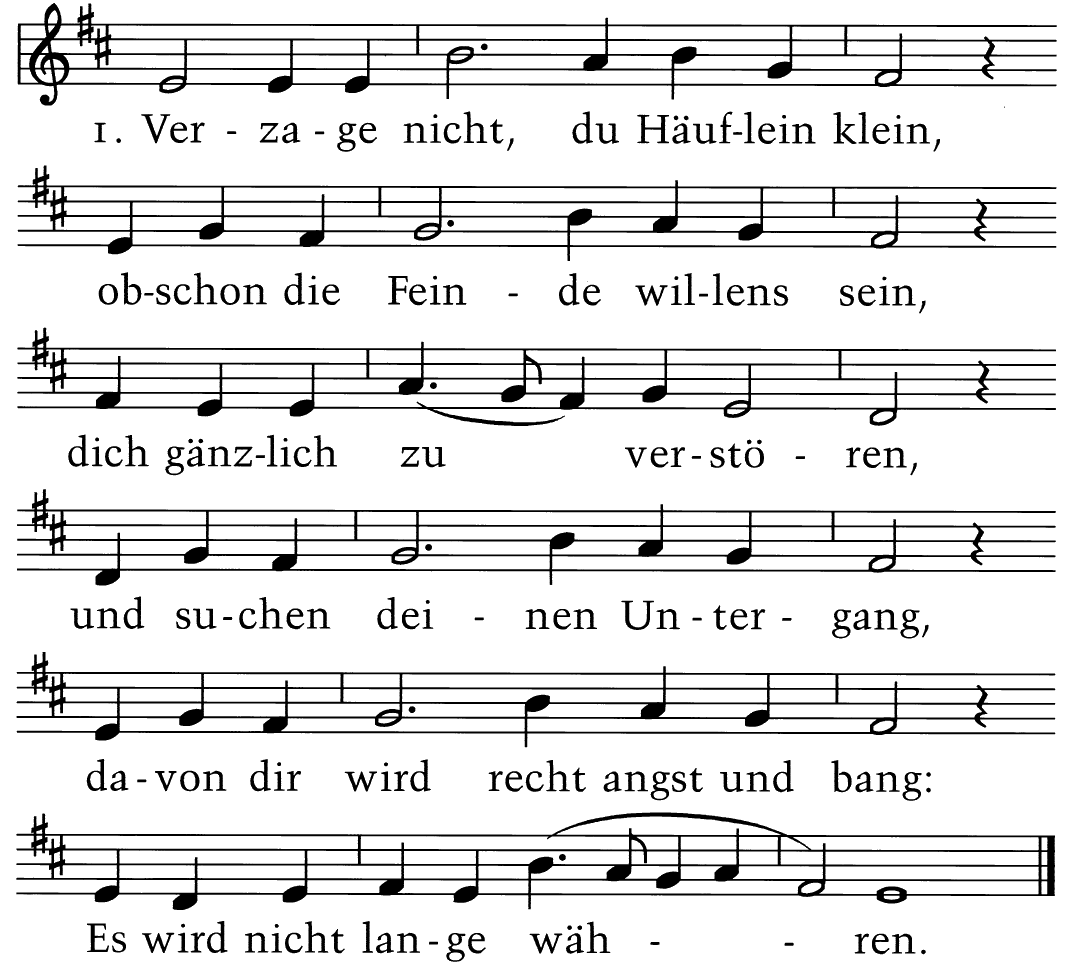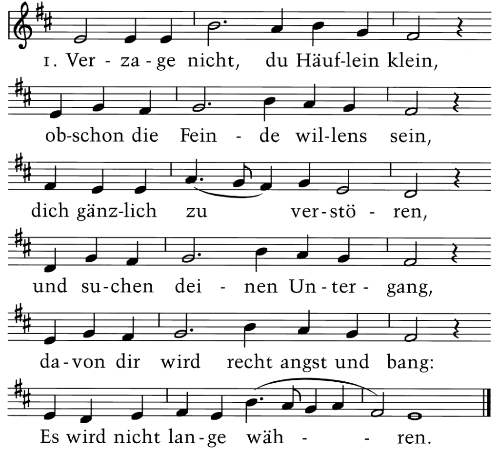 Verzage nicht, du Häuflein klein, obschon die Feinde willens sein, Dich gänzlich zu verstören, und suchen Deinen Untergang, davon Dir wird recht angst und bang: es wird nicht lange währen.