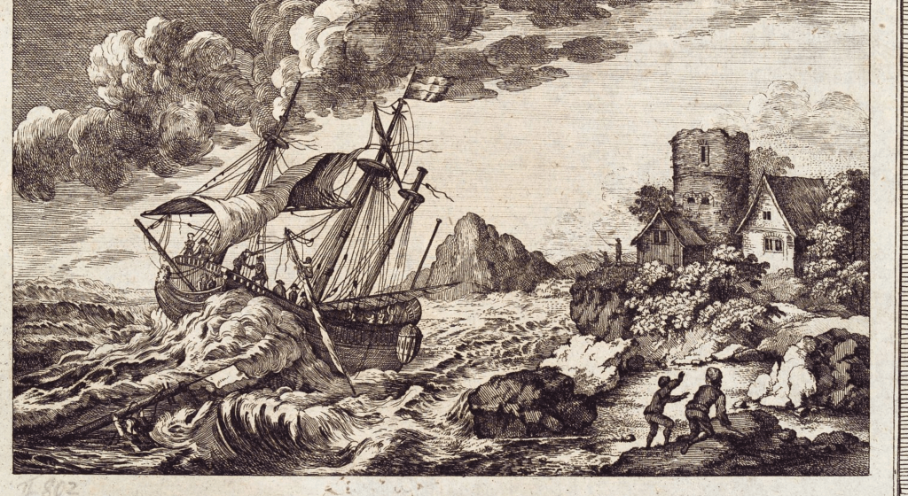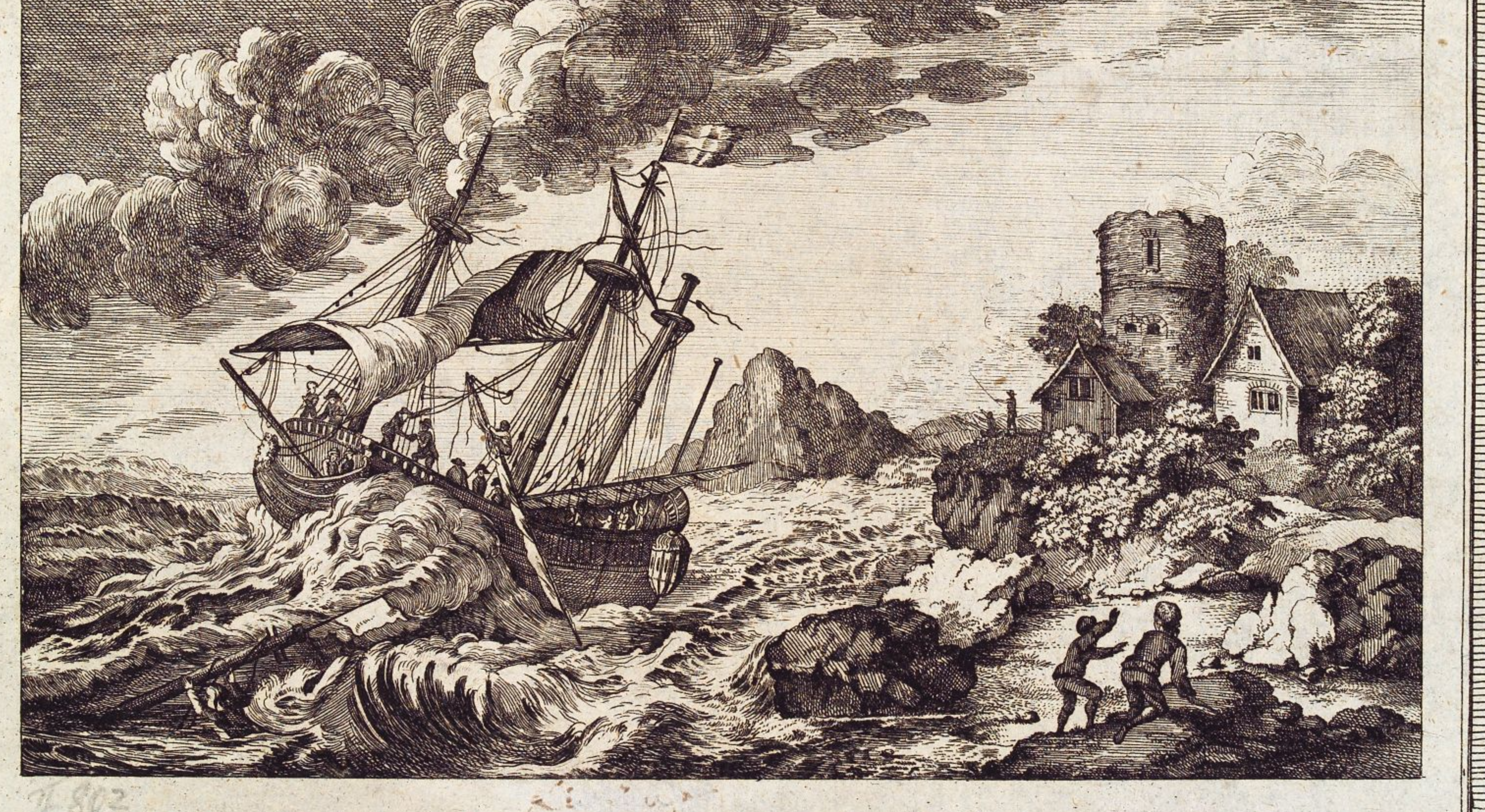 Schiff in einem Meeressturm, sich vor einer Küste befindend. (Herzog August Bibliothek Wolfenbüttel)