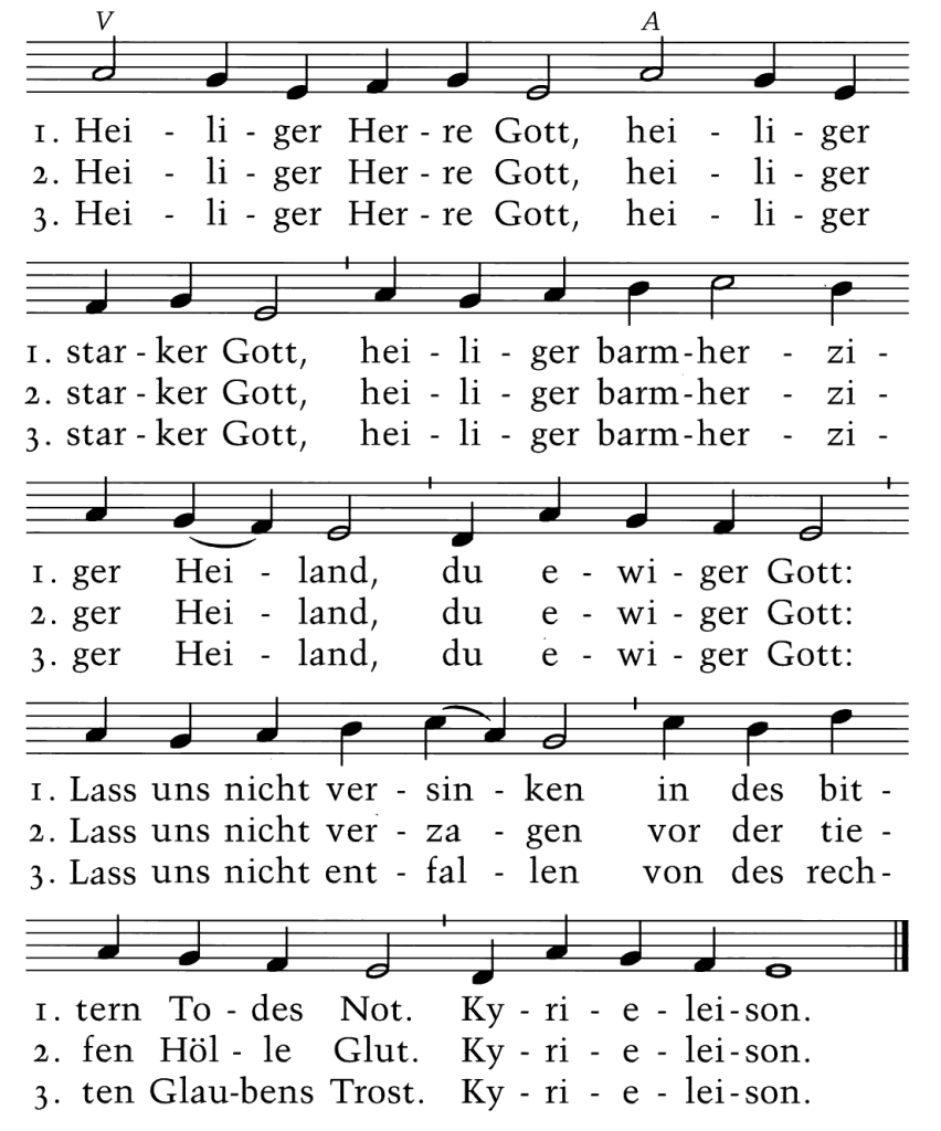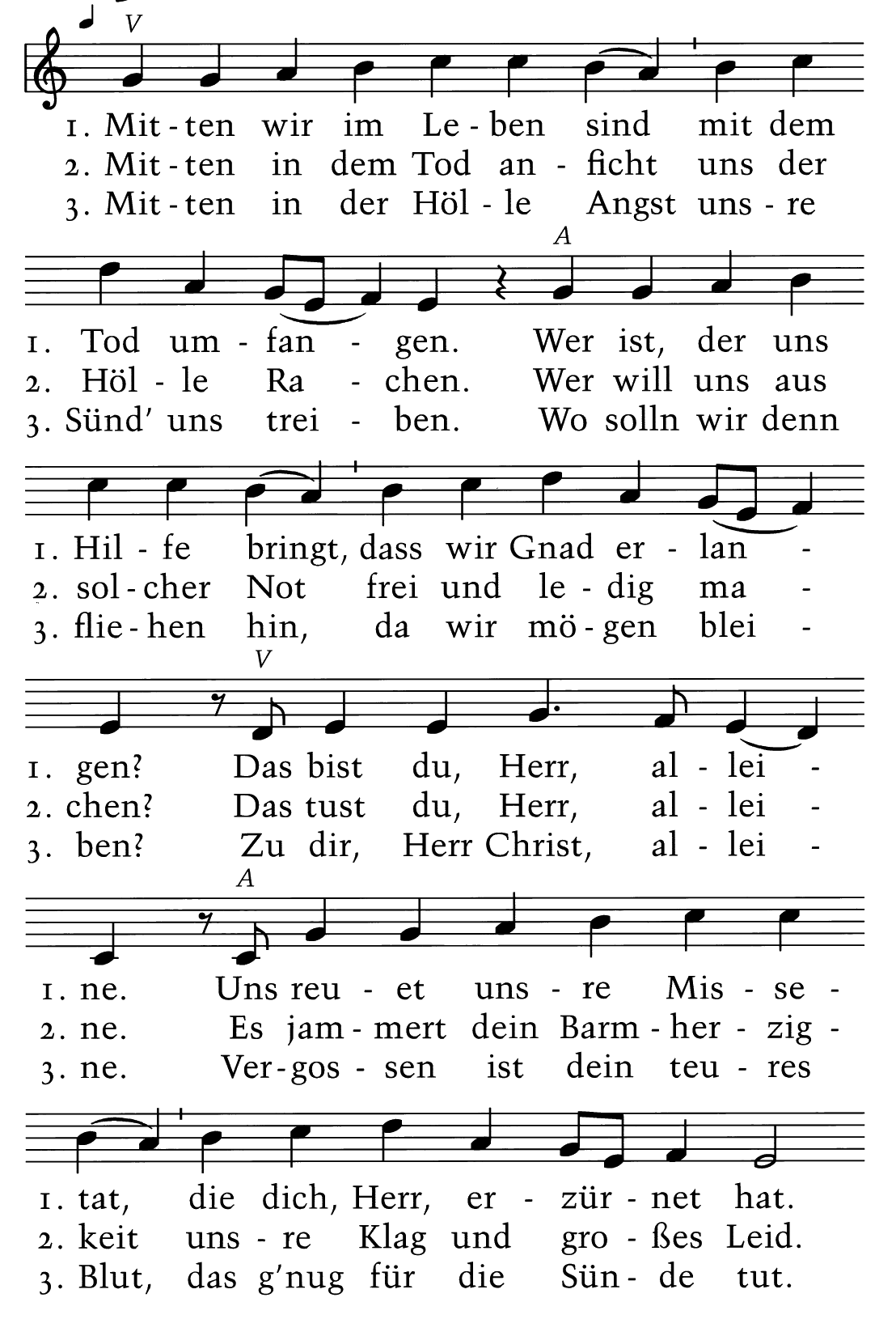 Mitten wir im Leben sind mit dem Tod umfangen. Wer ist, der uns Hilfe bringt, daß wir Gnad erlangen? Das bist Du, Herr, alleine. Uns reuet unsre Missetat, die Dich, Herr, erzürnet hat. Heiliger Herre Gott, heiliger starker Gott, heiliger barmherziger Heiland, Du ewiger Gott: Laß uns nicht versinkenin des bittern Todes Not. Kyrieleison.