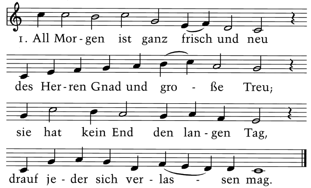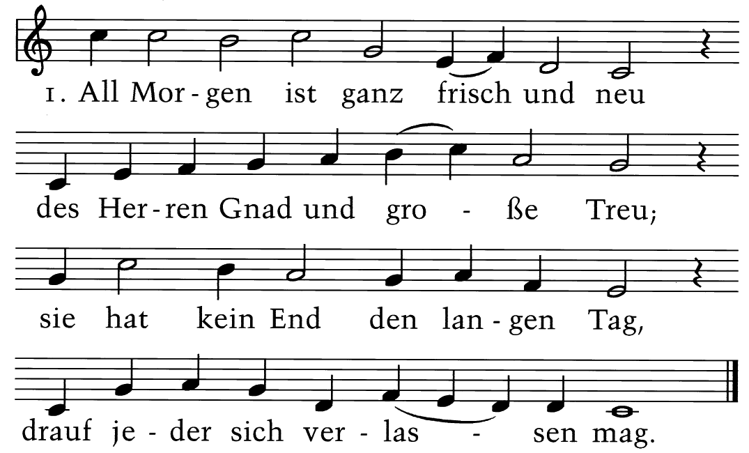All Morgen ist ganz frisch und neu des Herren Gnad und große Treu; sie hat kein End den langen Tag, drauf jeder sich verlassen mag.