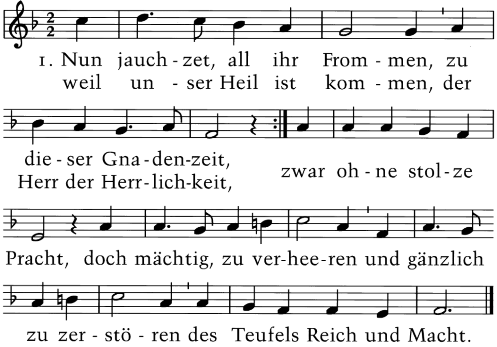Nun jauchzet, all ihr Frommen, zu dieser Gnadenzeit, weil unser Heil ist kommen, der Herr der Herrlichkeit, zwar ohne stolze Pracht doch mächtig, zu verheeren und gänzlich zu zerstören des Teufels Reich und Macht.