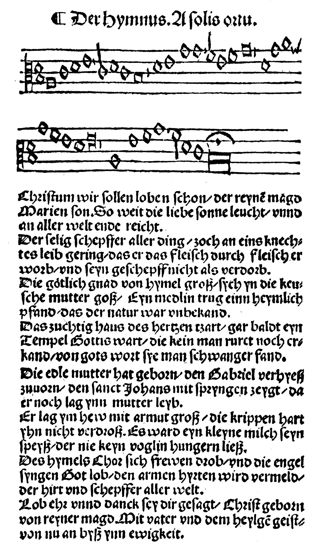 Lob ehr vnnd danck sey dir gesagt Christ geborn von reyner magd. Mit vater vnd dem heylgen geist von nu an byß ynn ewigkeit.Hymnus des Bischofs Caelius Sedulius (5.Jhd: A solis ortus cordine) verdeutscht von Dr. Martin Luther 1524.