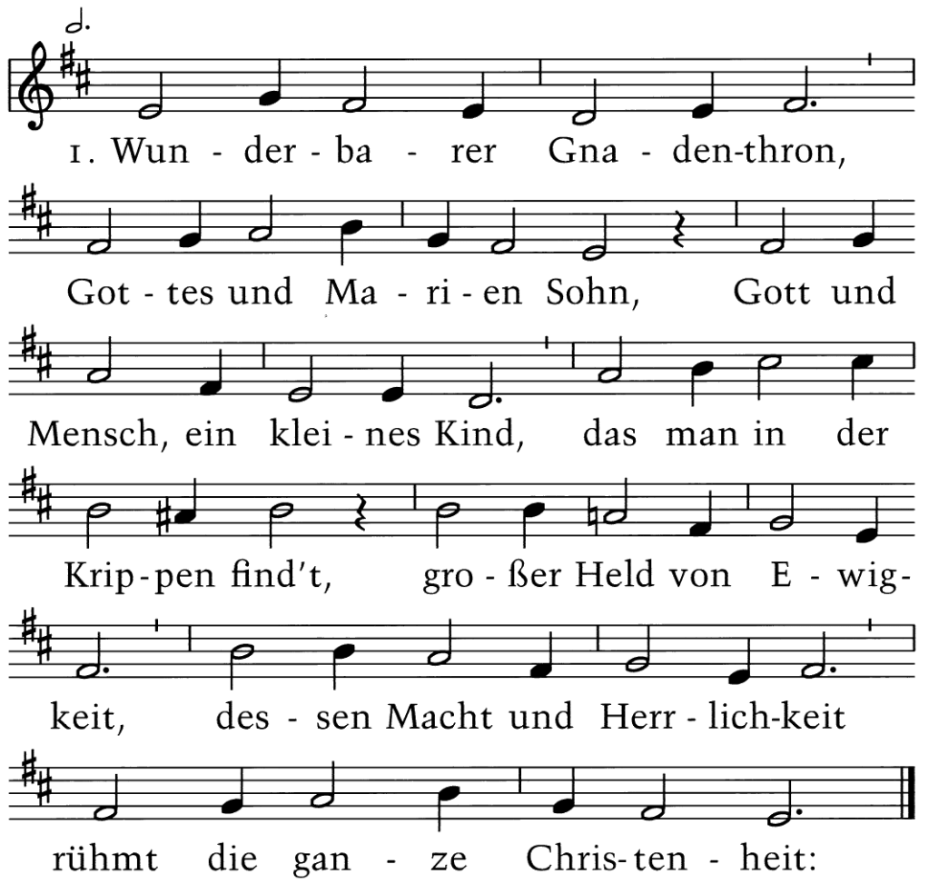 Wunderbarer Gnadenthron, Gottes und Marien Sohn, Gott und Mensch, ein kleines Kind, das man in der Krippen find’t, großer Held von Ewigkeit, dessen Macht und Herrlichkeit rühmt die ganze Christenheit: