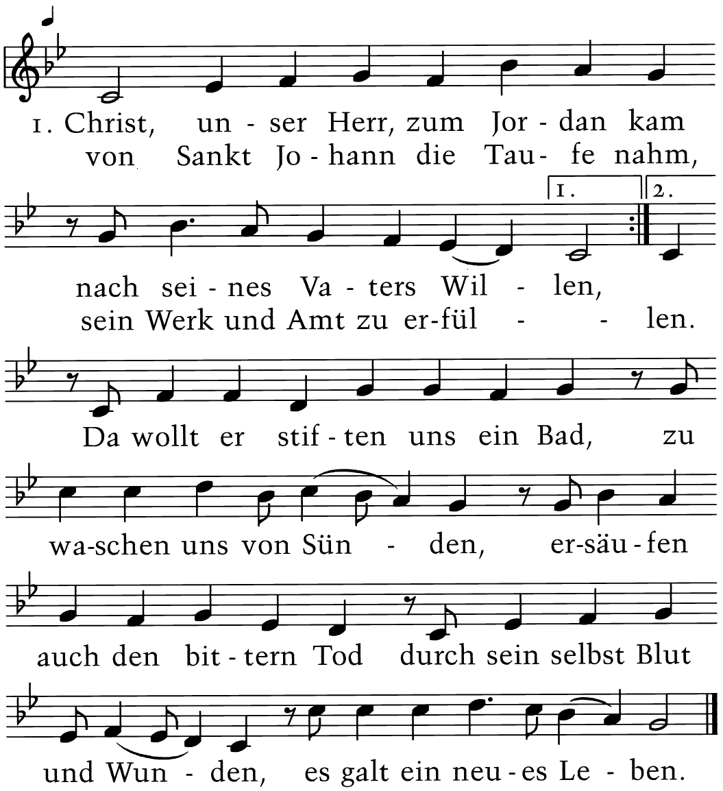 Christ, unser Herr, zum Jordan kam, nach seines Vaters Willen, von Sankt Johann die Taufe nahm, sein Werk und Amt zu erfüllen. Da wollt er stiften uns ein Bad, zu waschen uns von Sünden, ersäufen auch den bittern Tod durch sein selbst Blut und Wunden, es galt ein neues Leben.