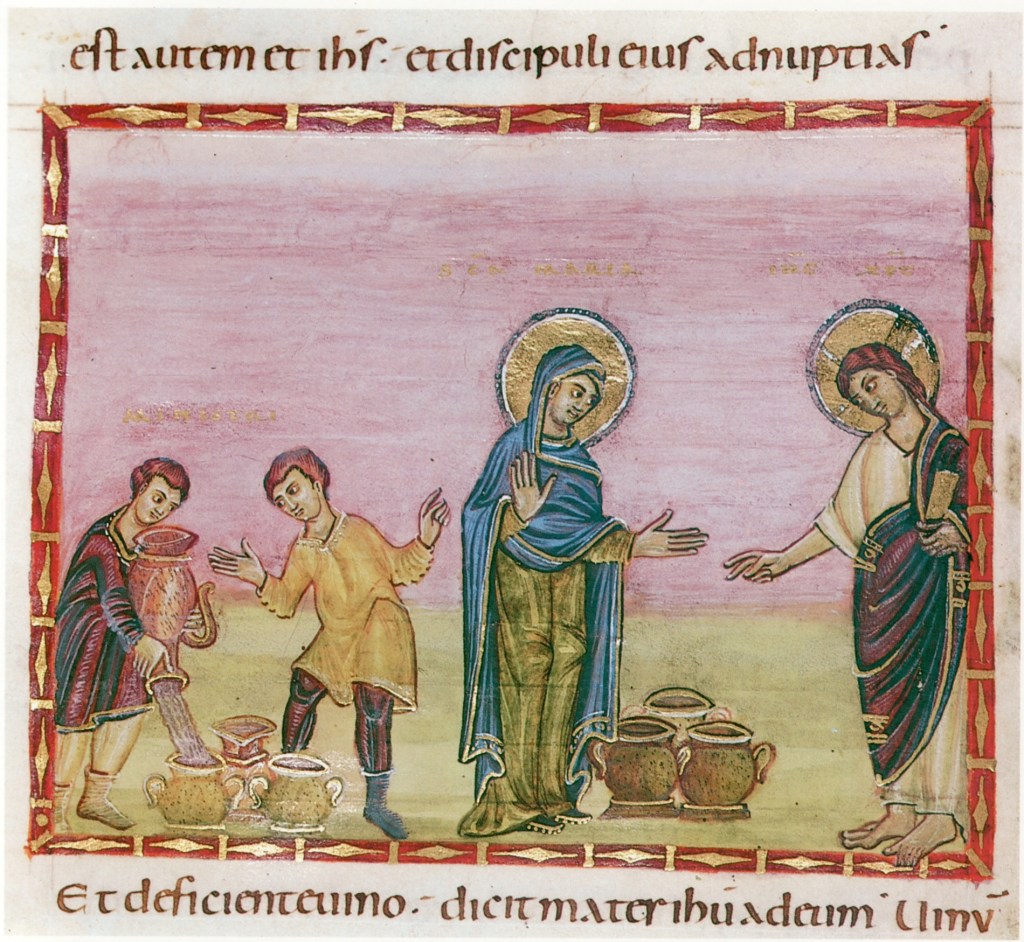 Und am dritten Tage war eine Hochzeit zu Kana in Galiläa, und die Mutter Jesu war da. Jesus aber und seine Jünger waren auch zur Hochzeit geladen. Und als der Wein ausging, spricht die Mutter Jesu zu ihm: Sie haben keinen Wein mehr. Jesus spricht zu ihr: Frau, was habe ich mit Dir zu schaffen? Meine Stunde ist noch nicht gekommen.