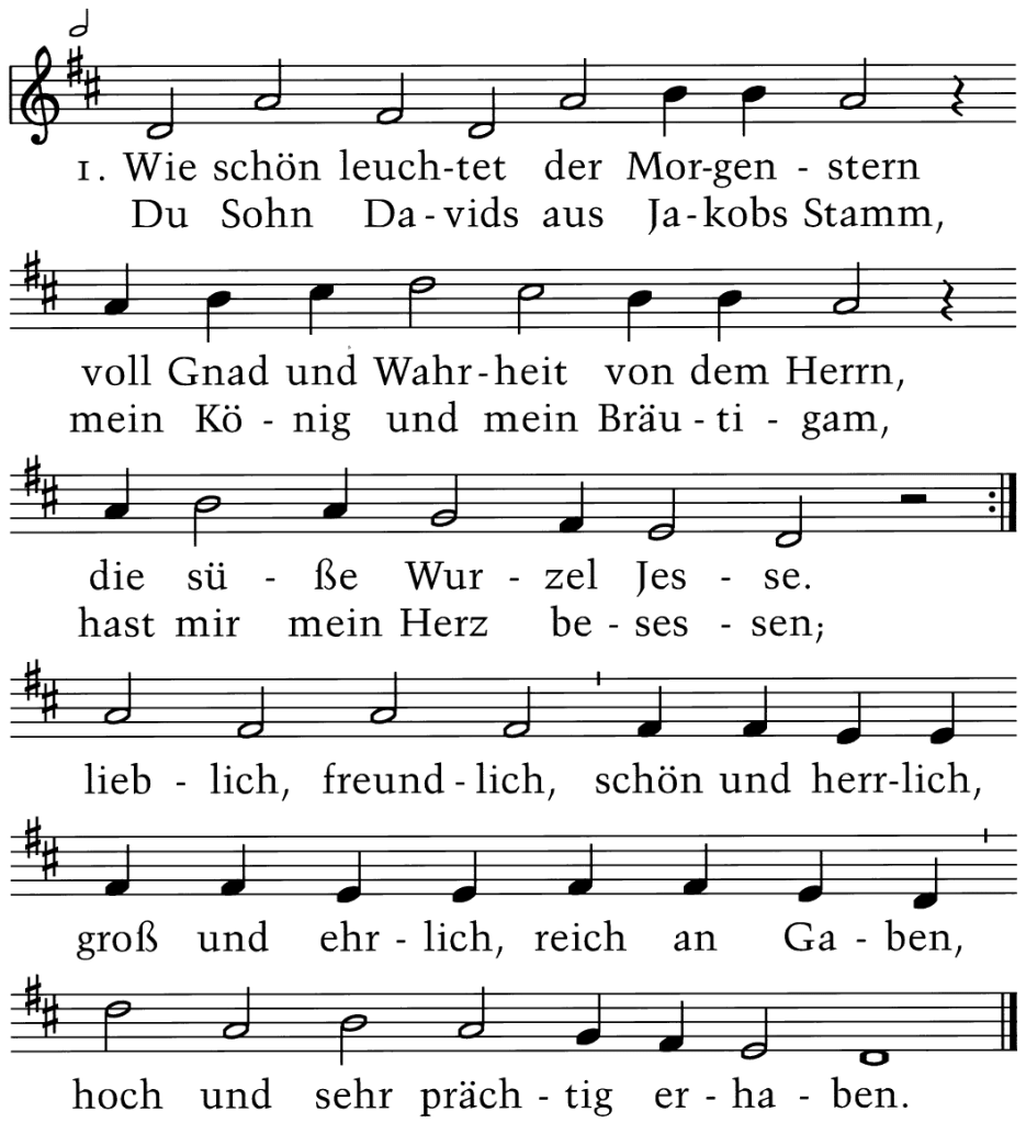 Wie schön leuchtet der Morgenstern voll Gnad und Wahrheit von dem Herrn, die Süße Wurzel Jesse. Du Sohn Davids aus Jakobs Stamm, mein König und mein Bräutigam, hast mir mein Herz besessen; lieblich, freundlich, schön und herrlich, groß und ehrlich, reich an Gaben, hoch und sehr prächtig erhaben.