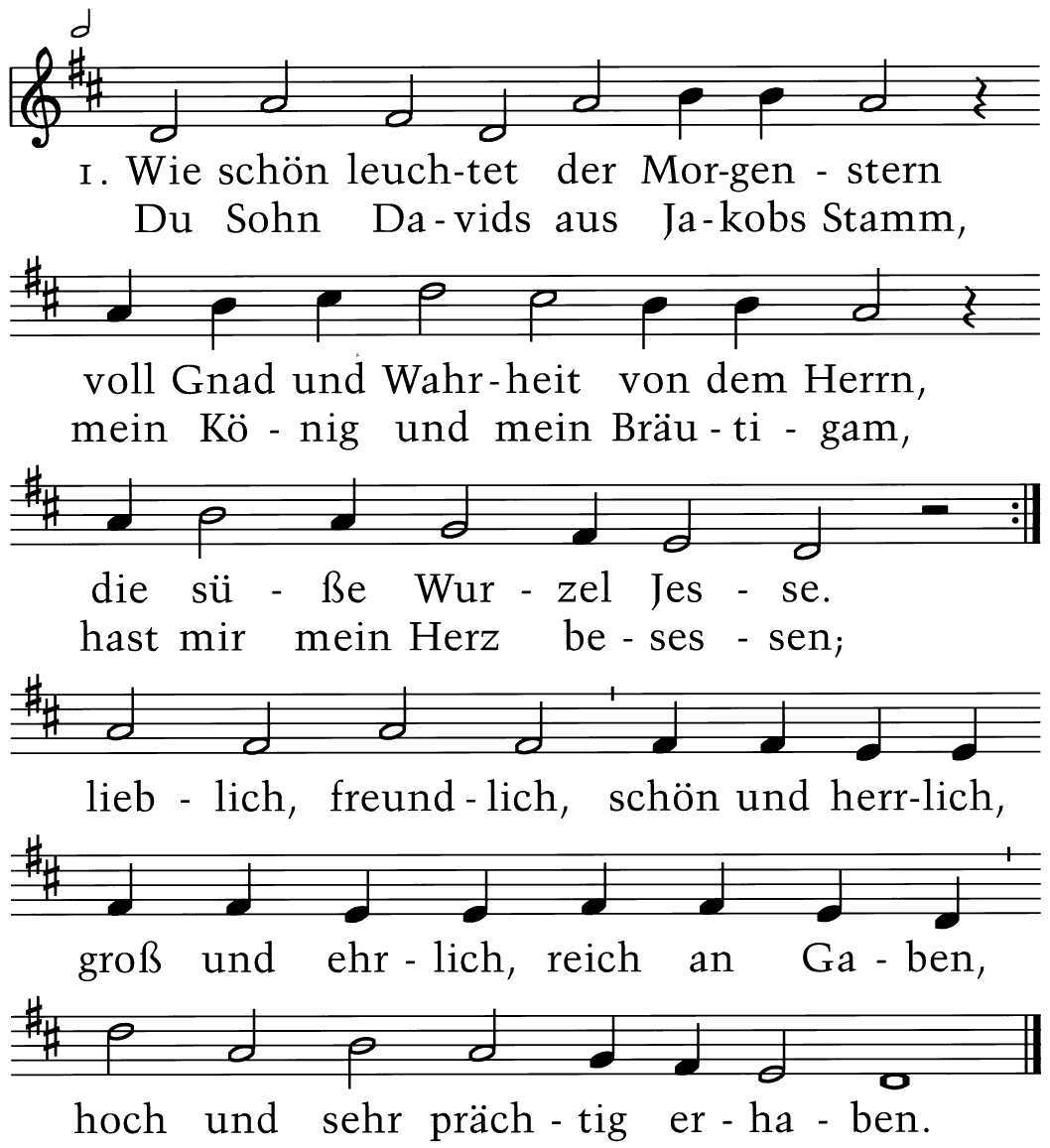 Wie schön leuchtet der Morgenstern voll Gnad und Wahrheit von dem Herrn, die Süße Wurzel Jesse. Du Sohn Davids aus Jakobs Stamm, mein König und mein Bräutigam, hast mir mein Herz besessen; lieblich, freundlich, schön und herrlich, groß und ehrlich, reich an Gaben, hoch und sehr prächtig erhaben.