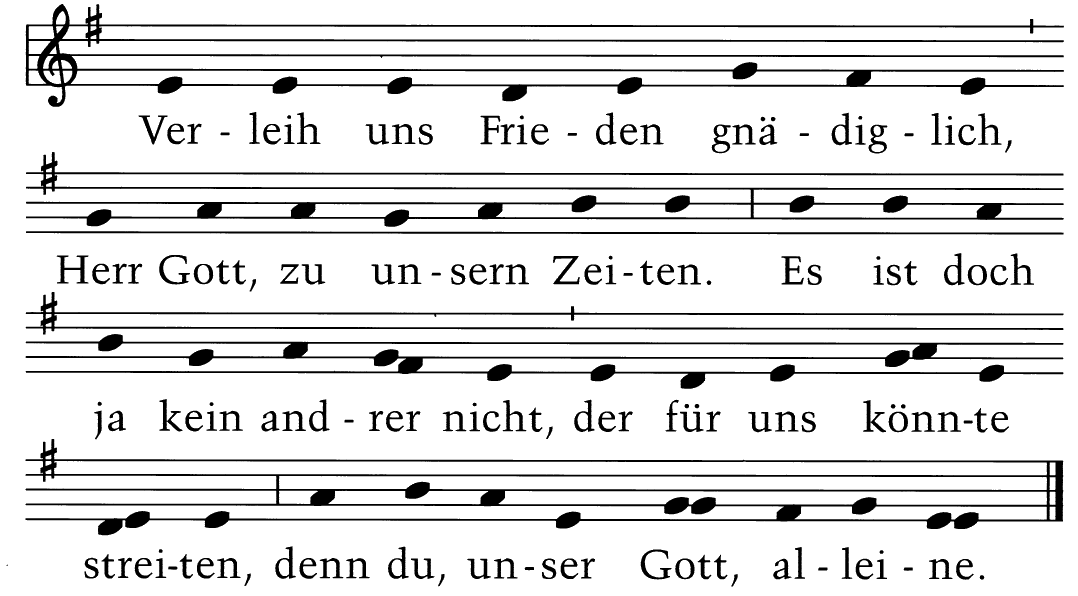 Verleih uns Frieden gnädiglich, Herr Gott, zu unsern Zeiten. Es ist doch ja kein anderer nicht, der für uns könnte streiten, denn Du, unser Gott, alleine.