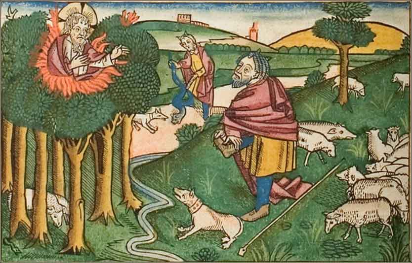 Mose aber hütete die Schafe Jitros, seines Schwiegervaters, des Priesters in Midian, und trieb die Schafe über die Wüste hinaus und kam an den Berg Gottes, den Horeb. Und der Engel des HERRN erschien ihm in einer feurigen Flamme aus dem Dornbusch. Und er sah, dass der Busch im Feuer brannte und doch nicht verzehrt wurde. Da sprach er: Ich will hingehen und diese wundersame Erscheinung besehen, warum der Busch nicht verbrennt. Als aber der HERR sah, dass er hinging, um zu sehen, rief Gott ihn aus dem Busch und sprach: Mose, Mose! Er antwortete: Hier bin ich. Er sprach: Tritt nicht herzu, zieh deine Schuhe von deinen Füßen; denn der Ort, darauf du stehst, ist heiliges Land!
