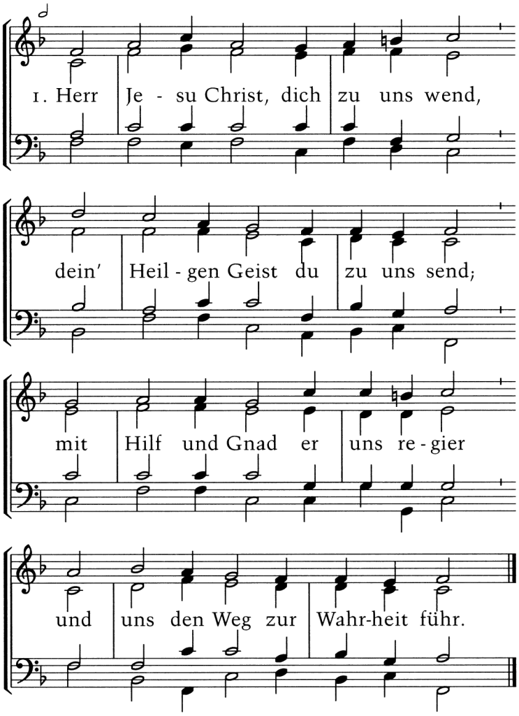 Herr Jesu Christ, Dich zu uns wend, Dein’ Heilgen Geist Du zu uns send; mit Hilf und Gnad er uns regier und uns den Weg zur Wahrheit führ.
