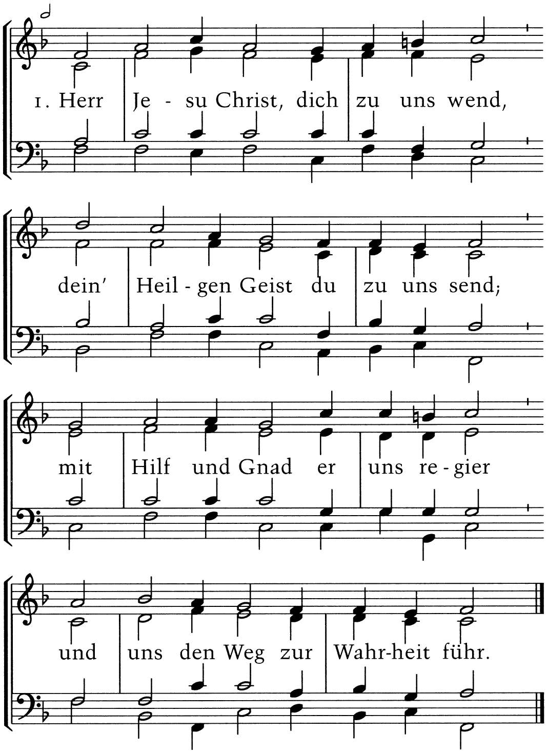 Herr Jesu Christ, Dich zu uns wend, Dein’ Heilgen Geist Du zu uns send; mit Hilf und Gnad er uns regier und uns den Weg zur Wahrheit führ.