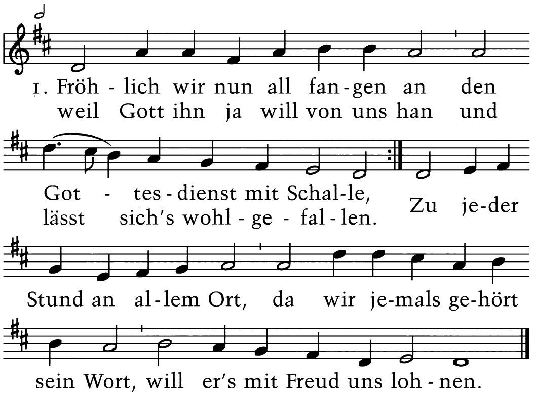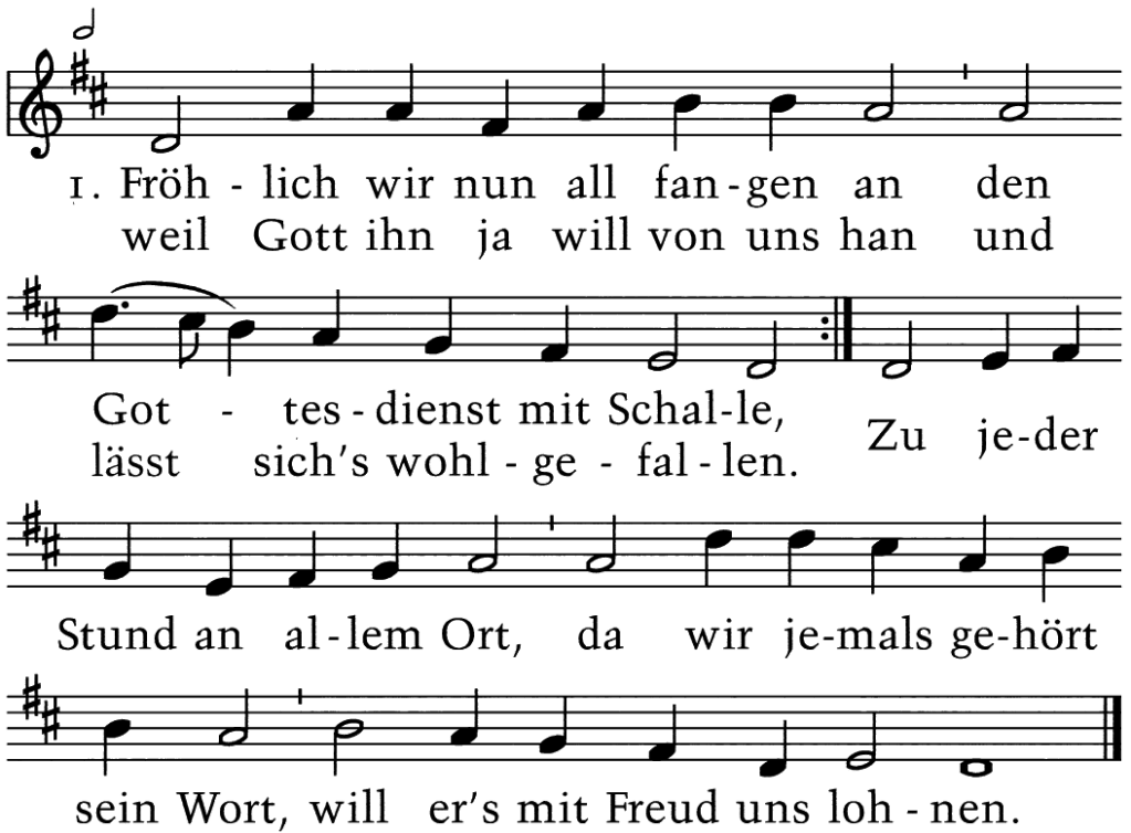 Fröhlich wir nun all fangen an den Gottesdienst mit Schalle, weil Gott ihn ja will von uns han und läßt sich’s wohlgefallen. Zu jeder Stund an allem Ort, da wir jemals gehört sein Wort, will ers mit Freud uns lohnen.