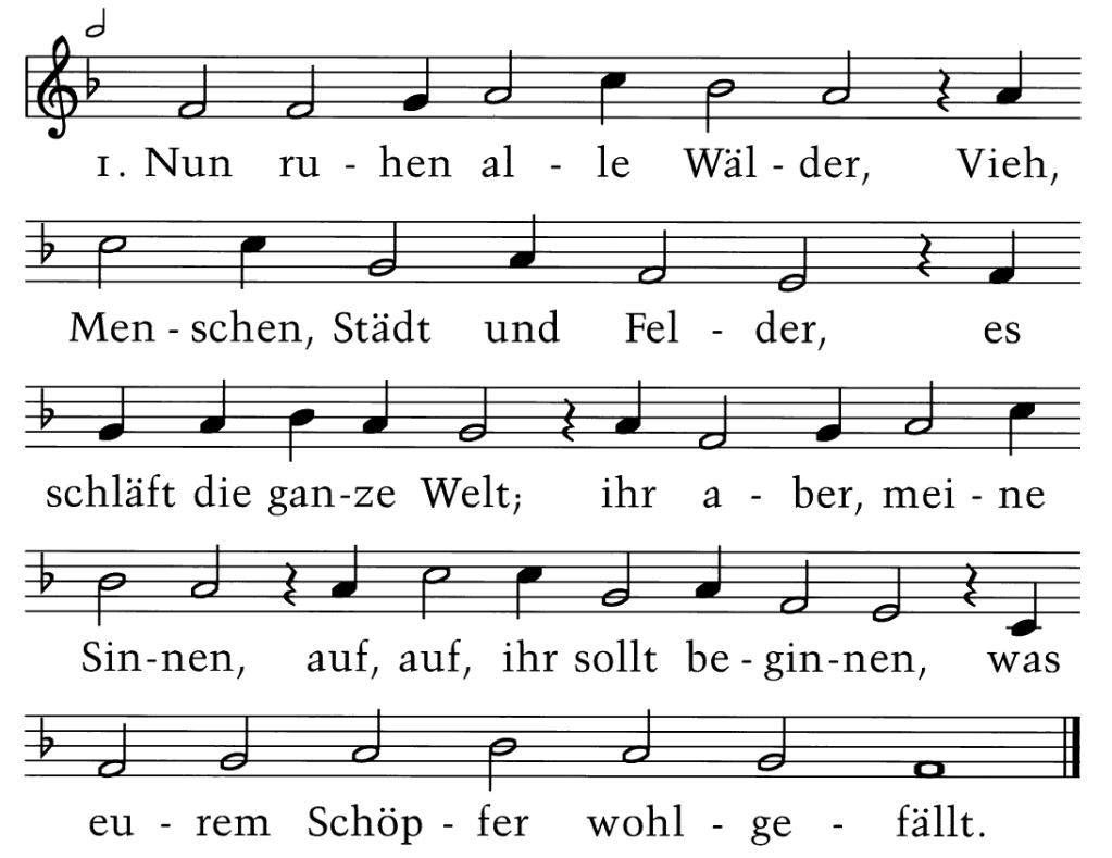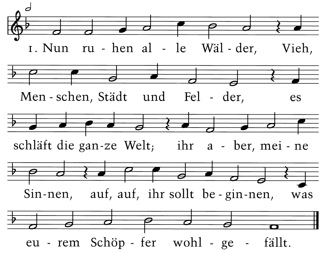 Nun ruhen alle Wälder, Vieh, Menschen, Städt und Felder, es schläft die ganze Welt; Ihr aber, meine Sinnen, auf, auf, Ihr sollt beginnen, was Eurem Schöpfer wohlgefällt.