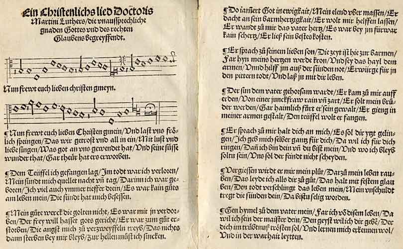 Nun freut euch, lieben Christen g’mein, und lasst uns fröhlich springen, daß wir getrost und all in ein mit Lust und Liebe singen, was Gott an uns gewendet hat und seine süße Wundertat; gar teu’r hat er’s erworben.